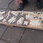 The preschoolers learned about bugs and creatures that might live in gardens. Together, we made salt-dough critters, placed them on the wood, toasted the wood with a blow-torch, then lifted them to reveal their shadows. The results were beautiful shadows of creatures and river rocks. – Sophie Noel