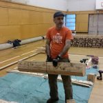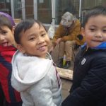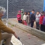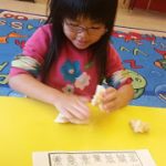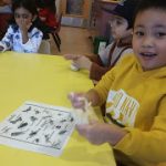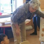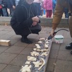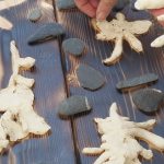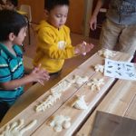The preschoolers learned about bugs and creatures that might live in gardens. Together, we made salt-dough critters, placed them on the wood, toasted the wood with a blow-torch, then lifted them to reveal their shadows. The results were beautiful shadows of creatures and river rocks. – Sophie Noel