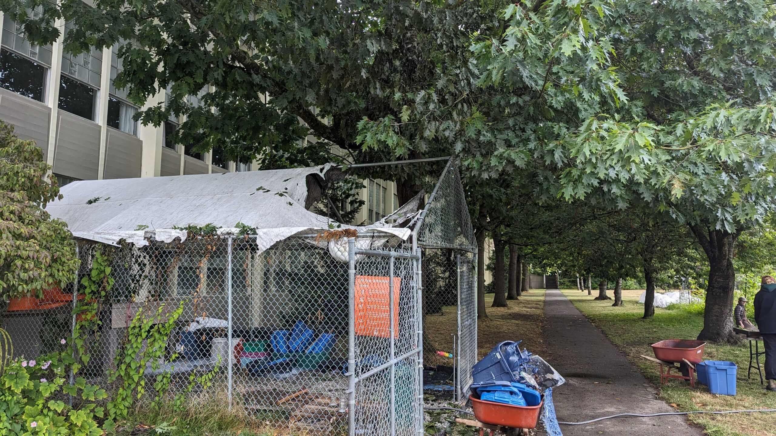 The melted harvest station and tote containers after the sudden fire outside of David Thompson Secondary School.